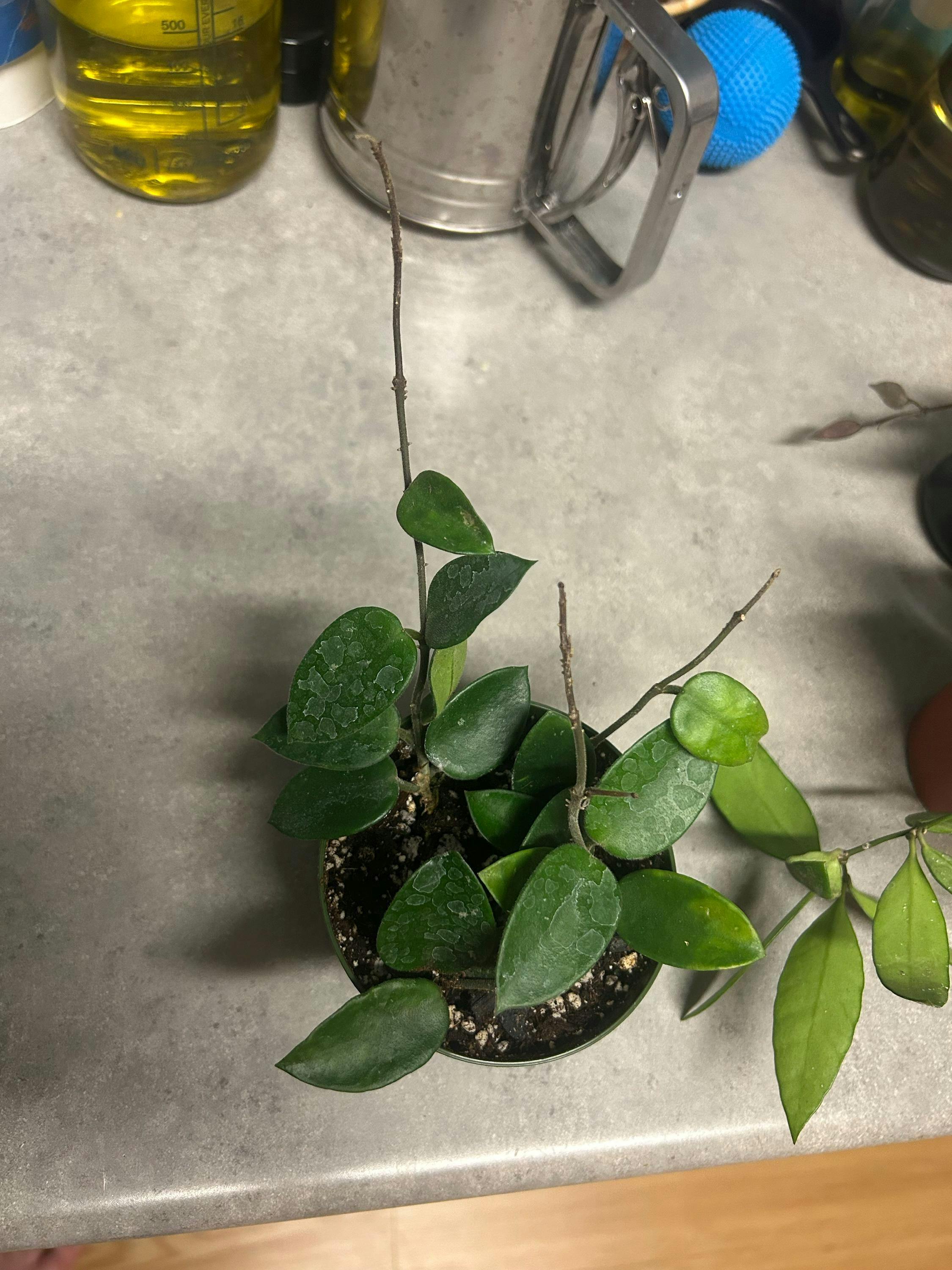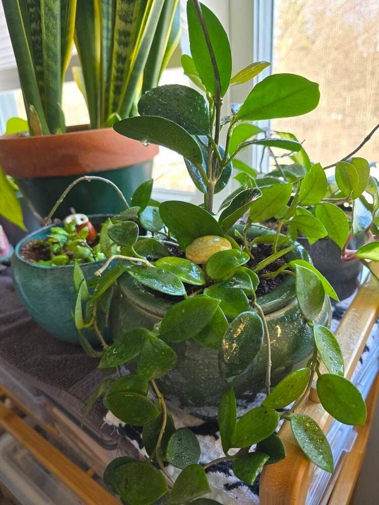 Hoya cv. Chouke has cute and dainty foliage that grows along winding vines that love to intertwines and latch onto each other. This Hoya is a quick grower and tends to be fairly easy for beginners. When in bloom, expect small clusters of light pink flowers with a purple center.