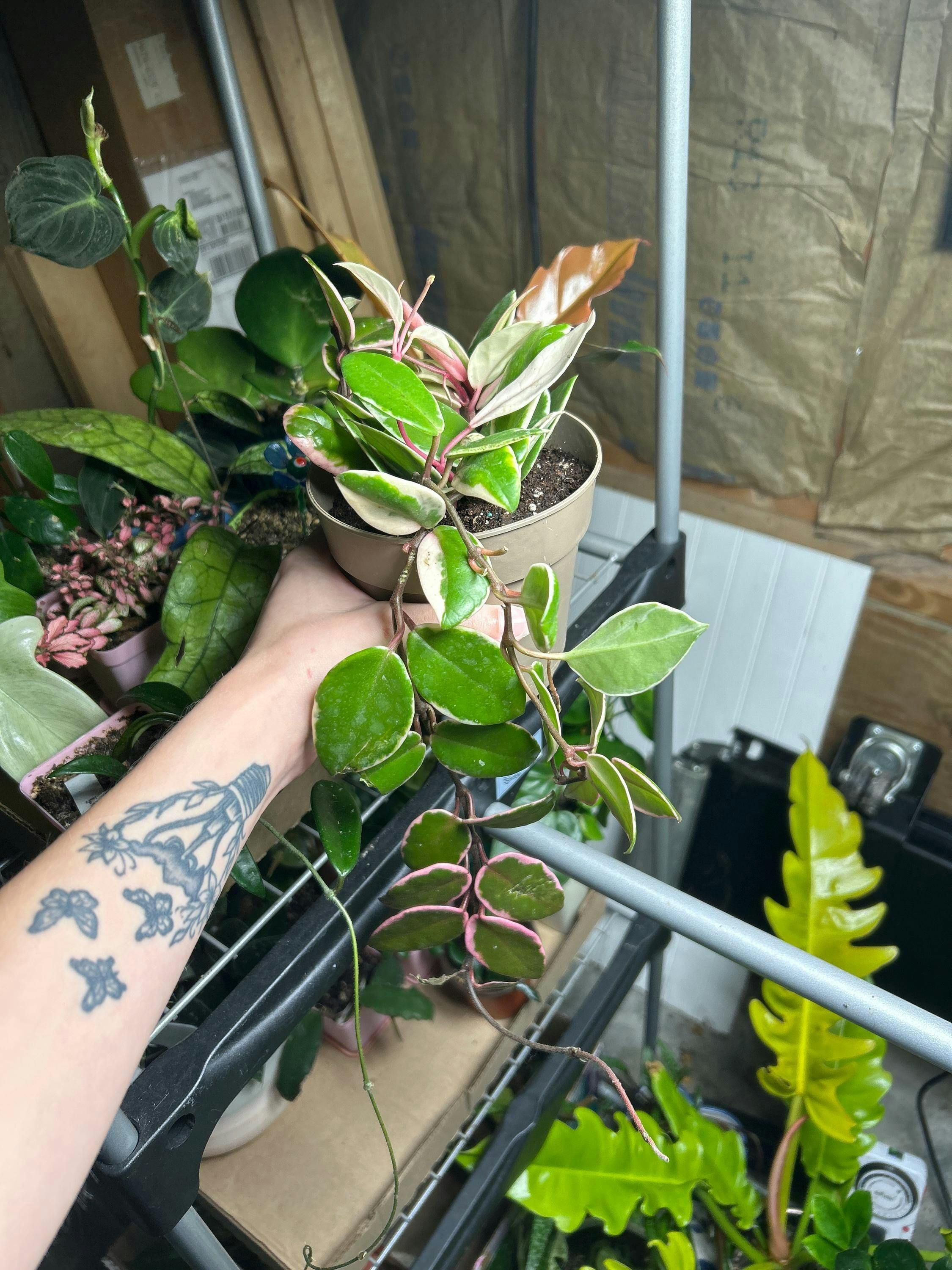 Hoya Flamingo Dream (Hoya carnosa ‘Purple Pride’) is a new sport variety that has elongated, veiny, and bright pink foliage. It is very similar to the Hoya Carnosa ‘Purple Pride’ which also sports the same type of very colorful foliage that keeps us all eagerly anticipating each and every new leaf. This plant loves to climb and does well when given a trellis or pole. New growth is brightly colored and does eventually fade to green as other tricolor Hoya.