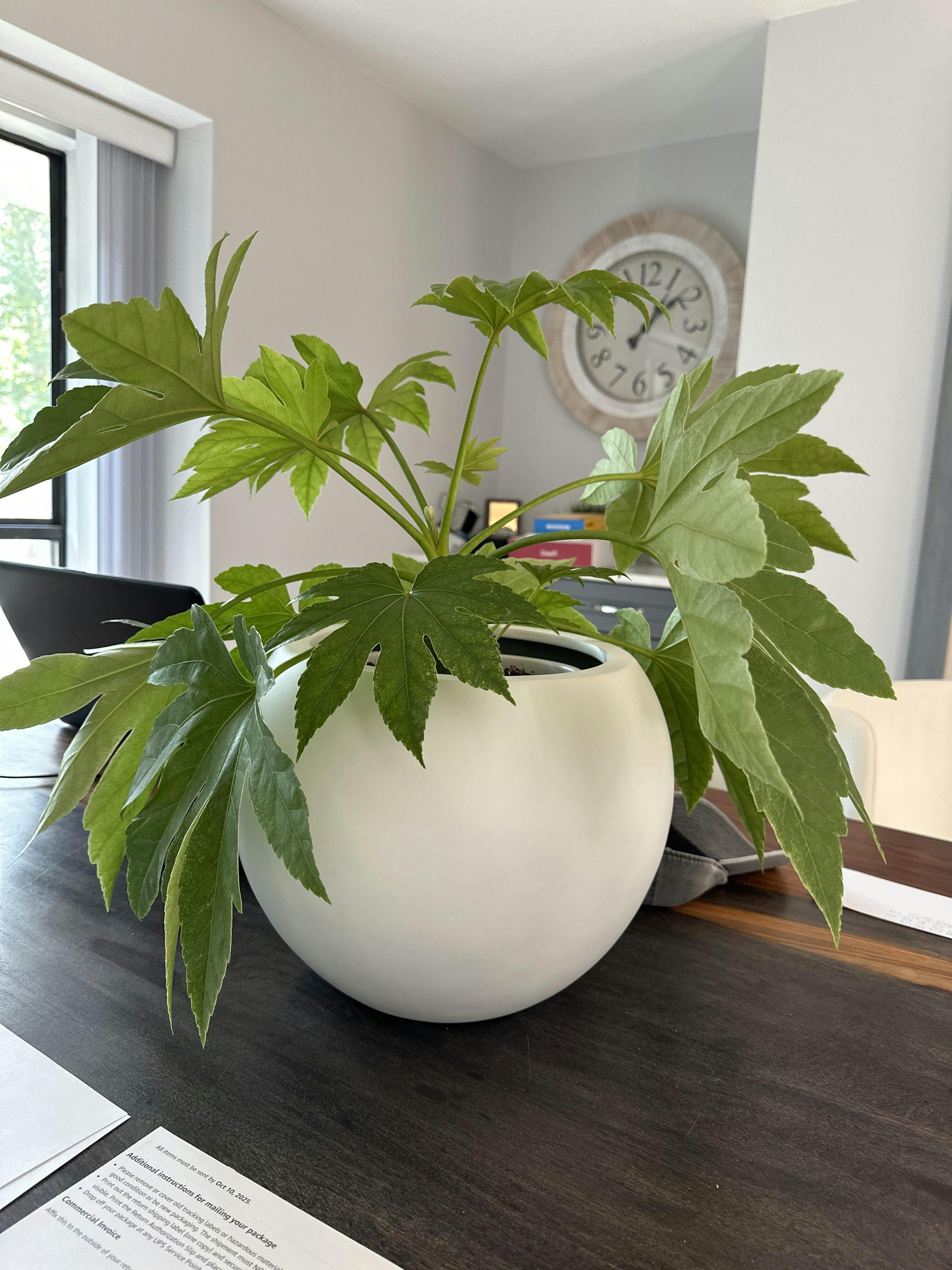 Fatsia is a genus of Japanese shrub with broad foliage and sparsely branched stems. This variety has stark-white splash and splatter variegation that contrasts perfectly against the dark green oak-shaped foliage.variegation will vary. New growth should have more variation when kept in bright and directly. This plant may be tricky and requires attention to care.