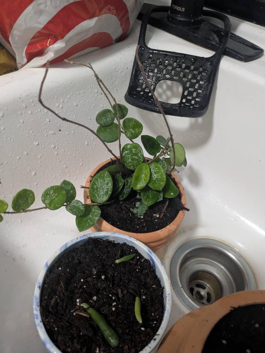 Hoya Mathilde Splash has cute and dainty oval foliage with heavy silver splash variegation that grows along winding vines that love to intertwine and latch onto each other. This Hoya is a quick grower and tends to be fairly easy for beginners. When in bloom, expect small clusters of light pink flowers with a purple center.